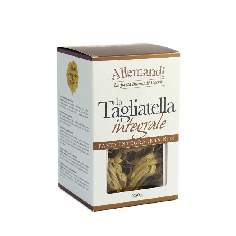 Le Tagliatelle all’Uovo Integrali vengono prodotte con il 50% di semola integrale. La nostra Pasta all’Uovo è prodotta con uova fresche e semola di prima qualità, esclusivamente trafilata al bronzo ed essiccata a basse temperature, sfruttando l’energia solare. I nidi vengono poi confezionati a mano, uno ad uno. Le Tagliatelle Integrali, più ricche di fibre e con un ridotto contenuto calorico, prediligono condimenti freschi, un semplice filo d’Olio extra vergine di oliva o sughi di verdure.