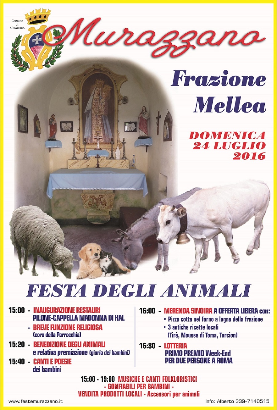 A Murazzano, in frazione Mella, Domenica 24 Luglio 2016 si terrà la FESTA DEGLI ANIMALI. Ecco il programma completo della manifestazione: